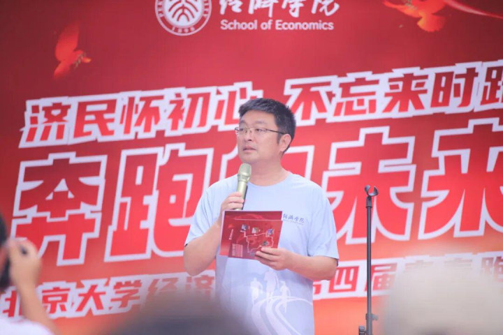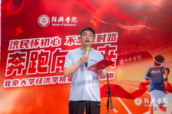 北京大学经济学院院长张辉代表学院致辞。他向所有工作人员表示感谢,并对参与师生表示热烈欢迎。他带领师生回顾党领导下中国人民走过的伟大征程,鼓励同学们不仅要在书斋课堂里深耕不辍,要在田间地头中扎根实践,更要在为国为民的奔跑中更加笃定“经世济民”的使命初心。他指出,今年是中国人民抗日战争暨世界反法西斯战争胜利80周年,新中国即将迎来76岁华诞,大家要心怀梦想、奋勇拼搏,一步一个脚印,一棒接着一棒,在奋力奔跑和接续奋斗中成就梦想。最后,张辉预祝活动圆满成功,希望每位师生在青春的奔跑中收获健康、磨砺心性、享受成长。