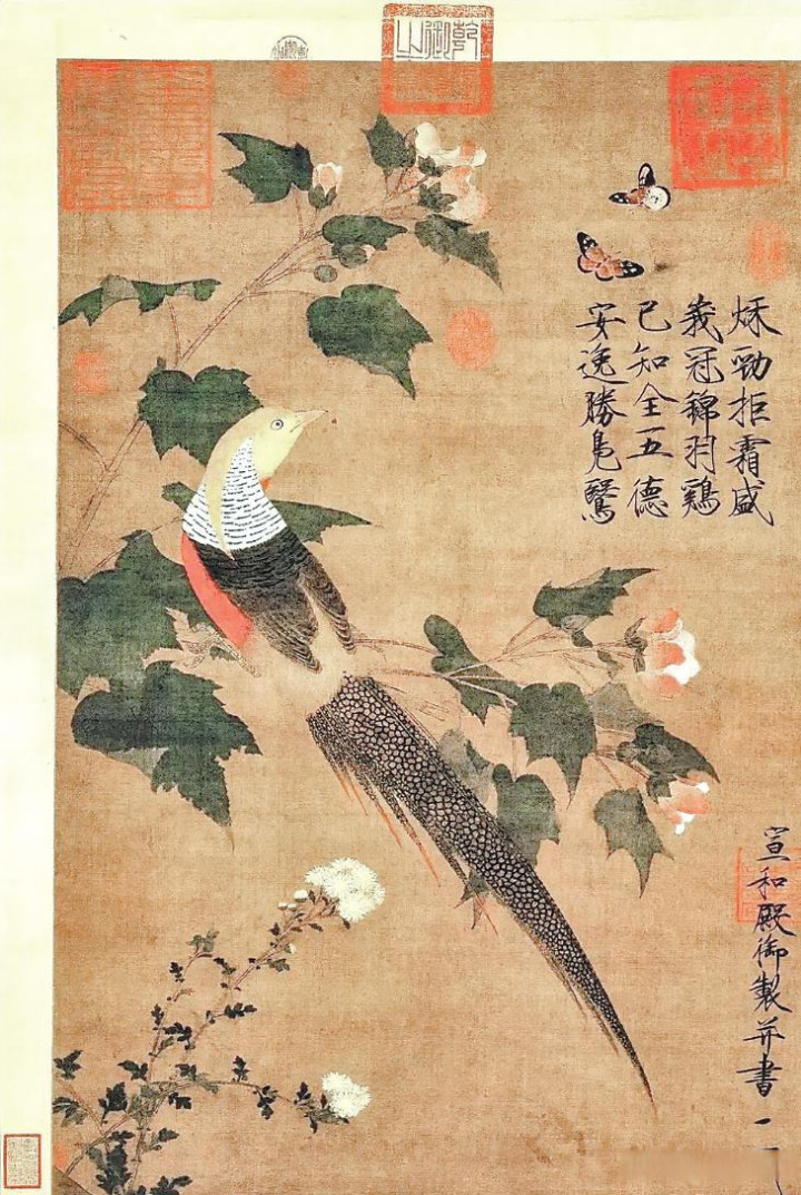 关于红腹锦鸡的古画,最有名的莫过于藏于故宫博物院的《芙蓉锦鸡图》,作者宋徽宗。赵佶艺术造诣绝高,他发展了宫廷绘画,本人也是花鸟画巨匠,《芙蓉锦鸡图》便是其笔下佳作。该画中所画的锦鸡兼具红腹锦鸡和白腹锦鸡的部分特征,因此对它的身份学界曾有争议。考虑到赵佶画作中“魔术般的写实主义”风格,2016年,科研工作者将该画与现代两种锦鸡的杂交个体进行羽色等对比分析,研究指出:宋徽宗画的是一只杂交锦鸡,这也是世界上关于鸟类杂交的最早记录。可以说《芙蓉锦鸡图》不仅蕴含着深厚的文化内涵,还揭示了中国古代花鸟画中潜藏的科学价值。