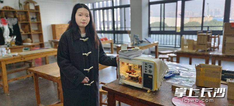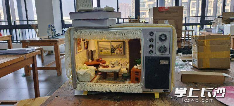 纯手工复刻往昔时光一个多月前,毕业指导老师布置了一项作业:以旧物品为载体进行创新设计。如何完成自己的毕业作品?20岁的屈鑫宇一直希望能以某种独特而永恒的方式,留住那些即将远去却无比珍贵的儿时记忆。来自衡阳的她,想起小时候在爷爷家见过的黑白电视机,于是决定发挥专业特长,从一台旧电视入手。她花150元从网上淘来旧电视,又购置了灯具等材料,开始了《旧时光里的新归处》创作。她小心地掏空电视机内部,将其改造为微缩舞台般的立体“画框”。“这个茶几是用PVC雪弗板做的,上面铺了羊毛毡。”屈鑫宇对“客厅”里的每一样物品都如数家珍,“沙发、壁画、落地灯是从网上淘的,总共花了500多元。”她补充道,买不到的物件便亲手制作,书柜、盆栽等皆出自她的巧手。“这里还装了三色灯光,可以用遥控器调节。”屈鑫宇介绍,这件作品前前后后花费了她一个多月的时间。在这方特别的“舞台”上,屈鑫宇倾注心血,以一桌一椅、一画一柜,精心复原记忆深处的场景:老式客厅、雅致陈设、温暖家常……每一处细节都凝聚着她的情感与巧思。原本播放动态影像的屏幕,如今定格为一个立体、生动、充满故事感的童年微缩景观。“心血总算是没有白费,作品得到了老师和同学们的认可。”屈鑫宇笑着说。这件作品有望被评为优秀毕业作品,并在学校展厅展出。这不仅仅是一台改造后的旧电视机,更如同一部视觉化的“时光留声机”,让大家仿佛能听见旧日里的笑语欢声。屈鑫宇用她独特的创作语言告诉我们,有些时光,永远不会“关机”。